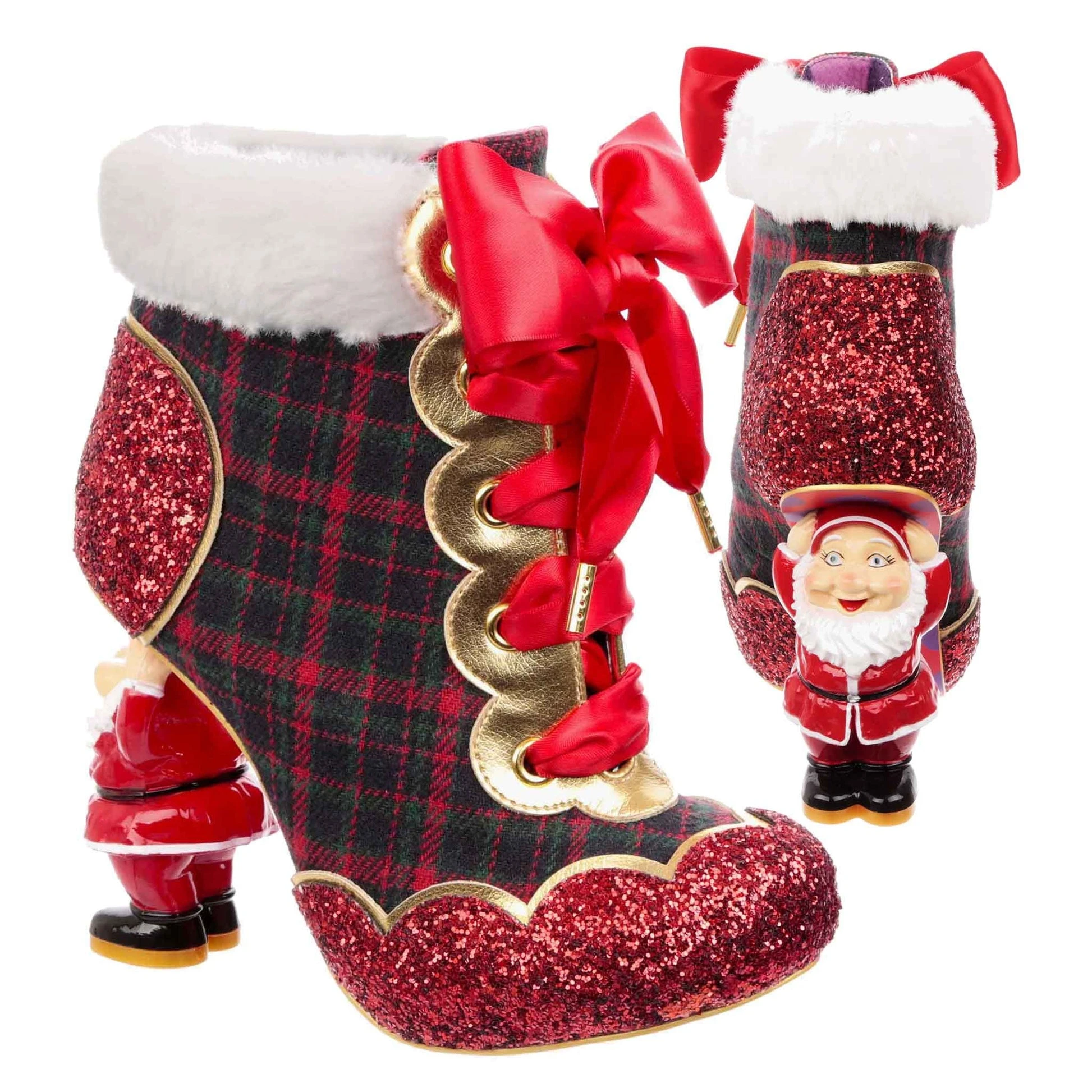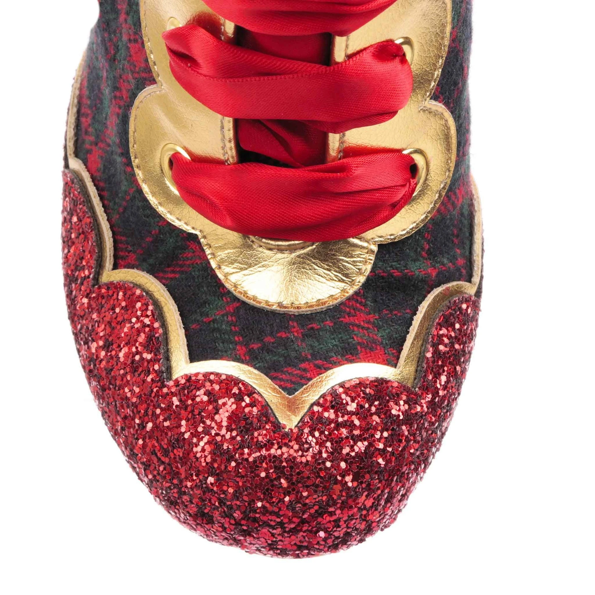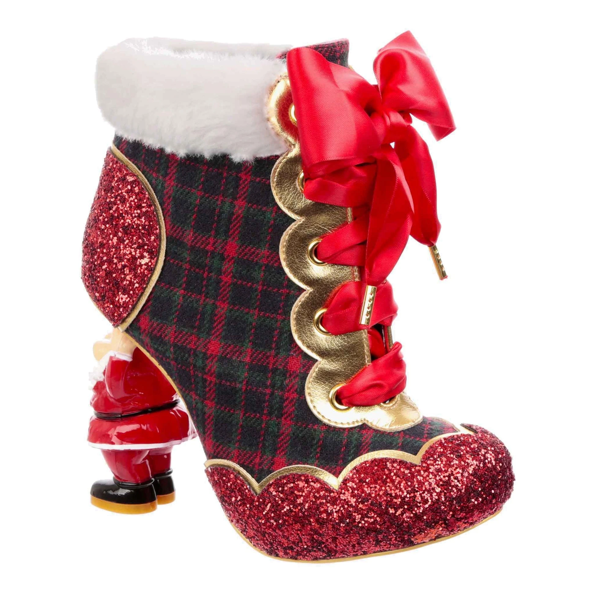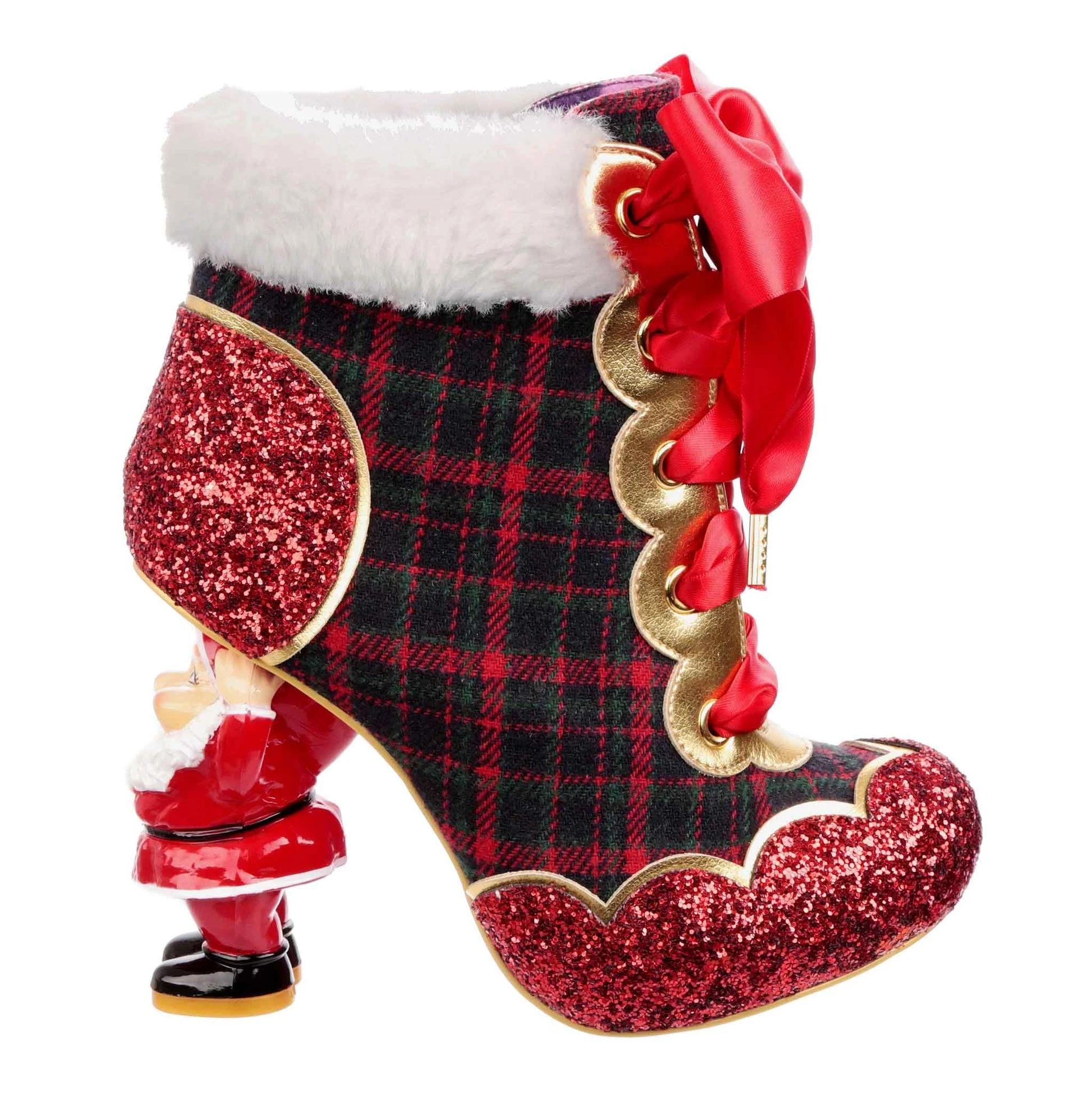Red and green tartan is paired with red glitter and cream faux fur in a classic festive palette! Featuring our favourite jolly fellow as a character heel, Father Christmas stands tall in his red suit which matches the wide red ribbon laces. These are perfect to complete any winter warmer outfit with flair!