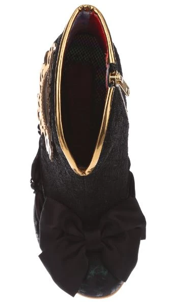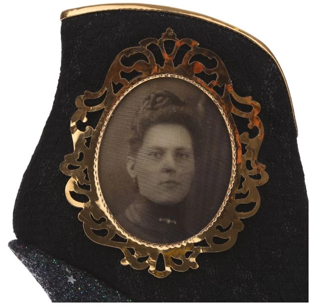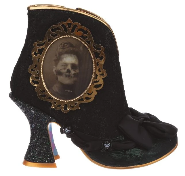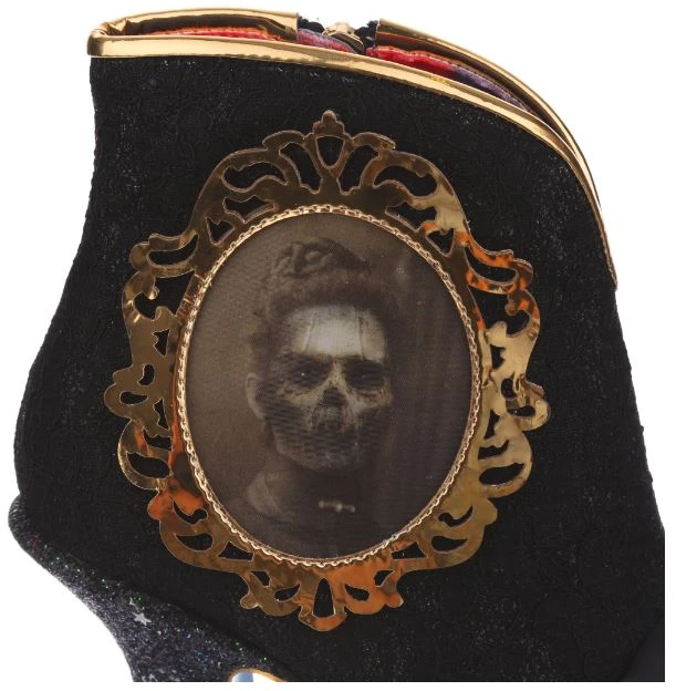 Feel like the elegant ghost you are in these fabulous boots! A dark dark green brocade paired with a moody textured black fabric, these boots are accented with draped swags pinned up by tiny spiders. An ornate golden frame features a picture with a surprise – a creepy portrait that decays to reveal a gruesome skull with each movement. Classy, elegant but also lots of spooky fun! These Halloween treats need to be in your collection, or else…
