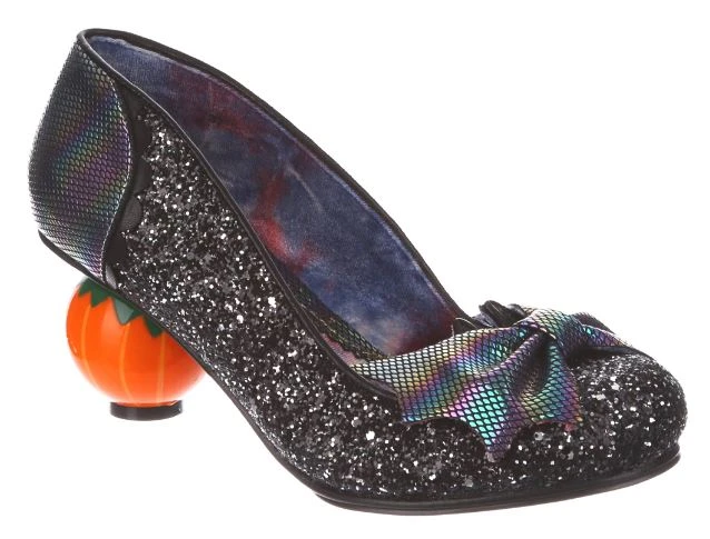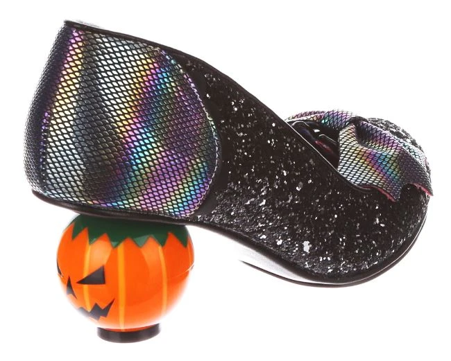 Go for a wander through the pumpkin patch with these spectacular and spooky shoes! Featuring an adorable character heel in the shape of a pumpkin, the charcoal black glitter upper is adorned with a statement bow that has striking bat wing edges. Black scalloping and piping are the perfect accents to really finish off these Halloween heroes!