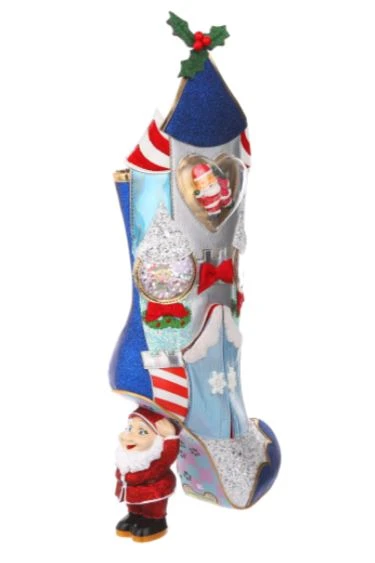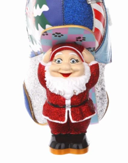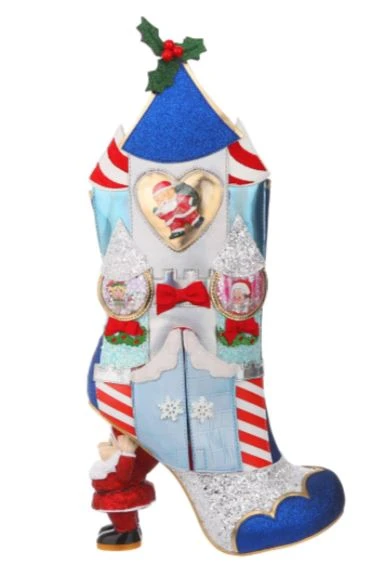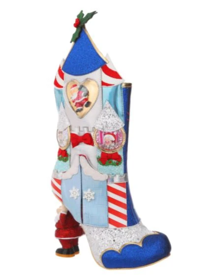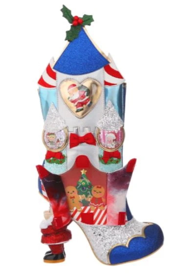 The ultimate festive boot! These look just like Santa’s workshop! Featuring our favourite jolly fellow as a character heel, and in a 3D heart on the side of the boot too! A magical cool toned, snow-inspired palette is complimented by the bright reds, to really make these pop! Be sure to check behind the doors for a surprise too! Interactive, fun and fabulous, these boots need to be yours!