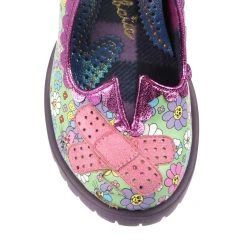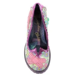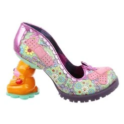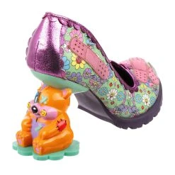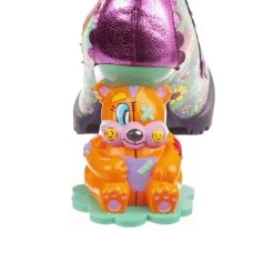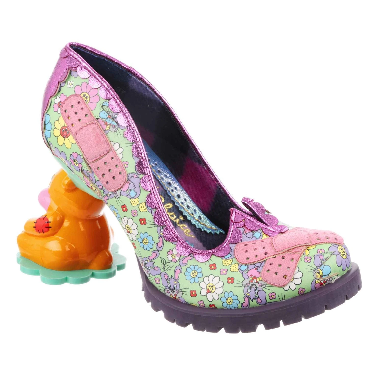 Put a plaster on it! These super cute green evil daisy print court shoes are topped with suede pink plasters on the side and the toe! A chunky sole adorns the front of the shoe, with this season’s character heel – the beat-up teddy bear in the rear! A fun and cute pair of shoes, sure to spark some interest!
