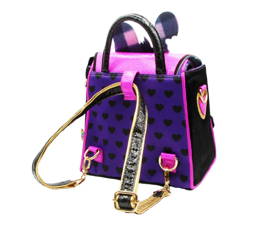 How spooky is this backpack? A large applique of our scruffy bunny sits upon a purple bag with repeat printed black hearts and is highlighted with bright pink closure, fixtures and piping. The black sides and base match the adjustable and removable strap. Add this creepy backpack to your wardrobe today!