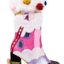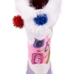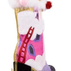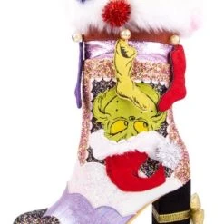 “These stockings” he grinned “are the first thing to go!” Give your feet a Who makeover with these festive boots! One side features a fireplace with The Grinch’s head poking out the chimney, adorned with 3D swinging Who-stockings all in a row. The other side shows the outside of the Who-house with a ladder and little Grinchy feet disappearing down the chimney! Both boots are topped with a white fluffy faux fur cuff, which is dotted with sparkling pom poms! The fabrics of the shoe are encrusted with glitter to really give those festive feels and add all that Christmassy luxury, make sure to nab them before the Mean One himself does!