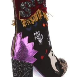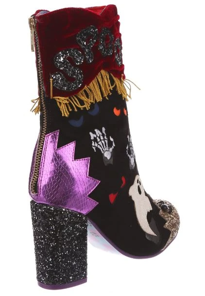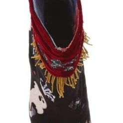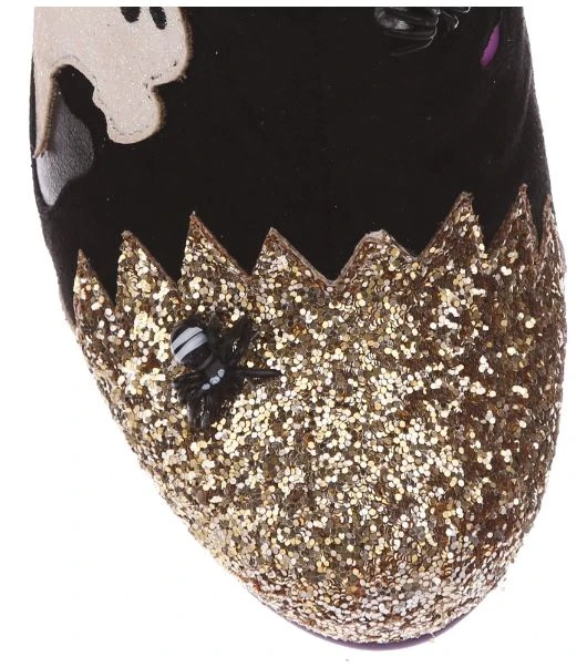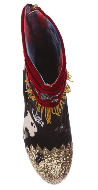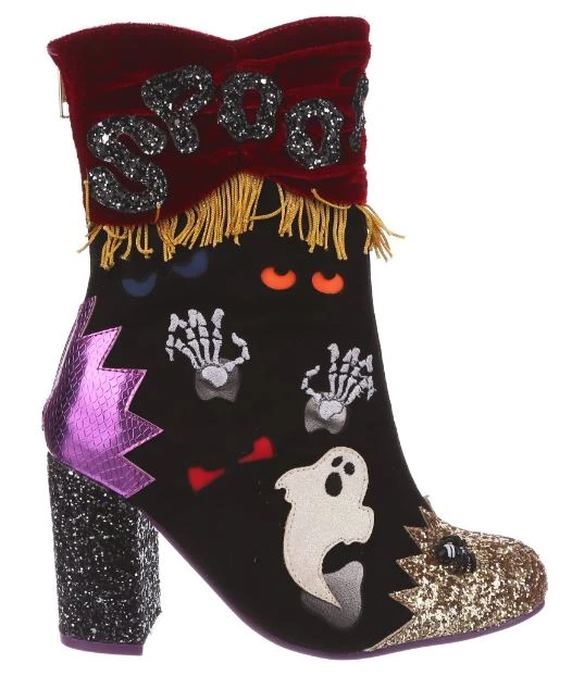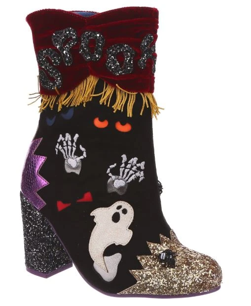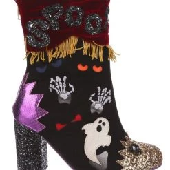 BOO! AHH! Dare you see what went bump in the night? These fabulous boots are sure to get your goose bumps tingling, with luxurious red velvet ruched detailing, accented by a golden fringed trim. All eyes will be on you in these fabulous shoes, these creepsome beauties are dotted with monster eyes that light up! Skeletons, ghosts and glitter galore – the perfect Irregular Halloween!