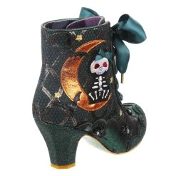 Get spooky whilst staying cute with these adorable boots! Featuring a shimmering metallic orange crescent moon, upon which sits a skeleton kitty! Dotted with bats and stars too, this teal-toned sequin and metallic beauty is sure to have you staying up to the witching hour, just to look at them!