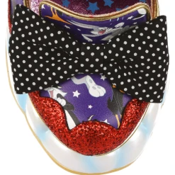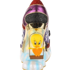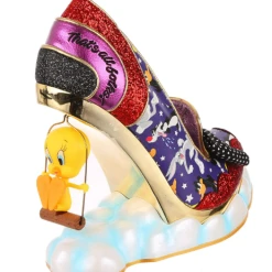 Oh Tweety, what do you see? Some fabulous shoes? That’s what we see too! This gorgeous pair of court shoes are all decked out in the cutest Looney Tunes print on a baby blue background, complemented by the stunning panelling in red glitter, and the adorable monochrome polka dot bow – these shoes are not to be missed! The true star of the show is the incredible character heel featuring an adorable Tweety sitting on a little swing – perched above the clouds! Add them to your life today and truly feel like you are walking on air!