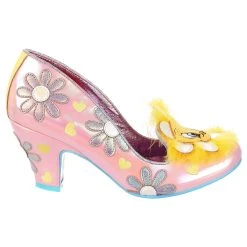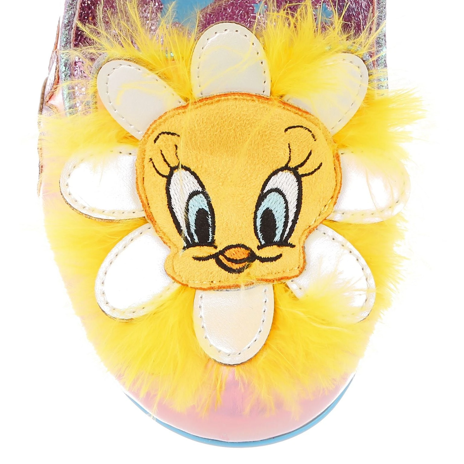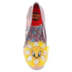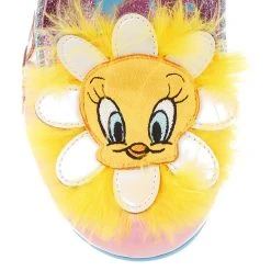 Tweeter than tweet, these Tweety heels are here to get you groovin! A shimmering iridescent pink upper is topped with retro lilac daisies and adorable yellow hearts, but the absolute star of the show is the fluffy flower on the toe! Featuring Tweety’s adorable face, surrounded by fluffy canary-yellow feathers and cute little petals, these shoes are sure to have you feeling blooming fabulous!