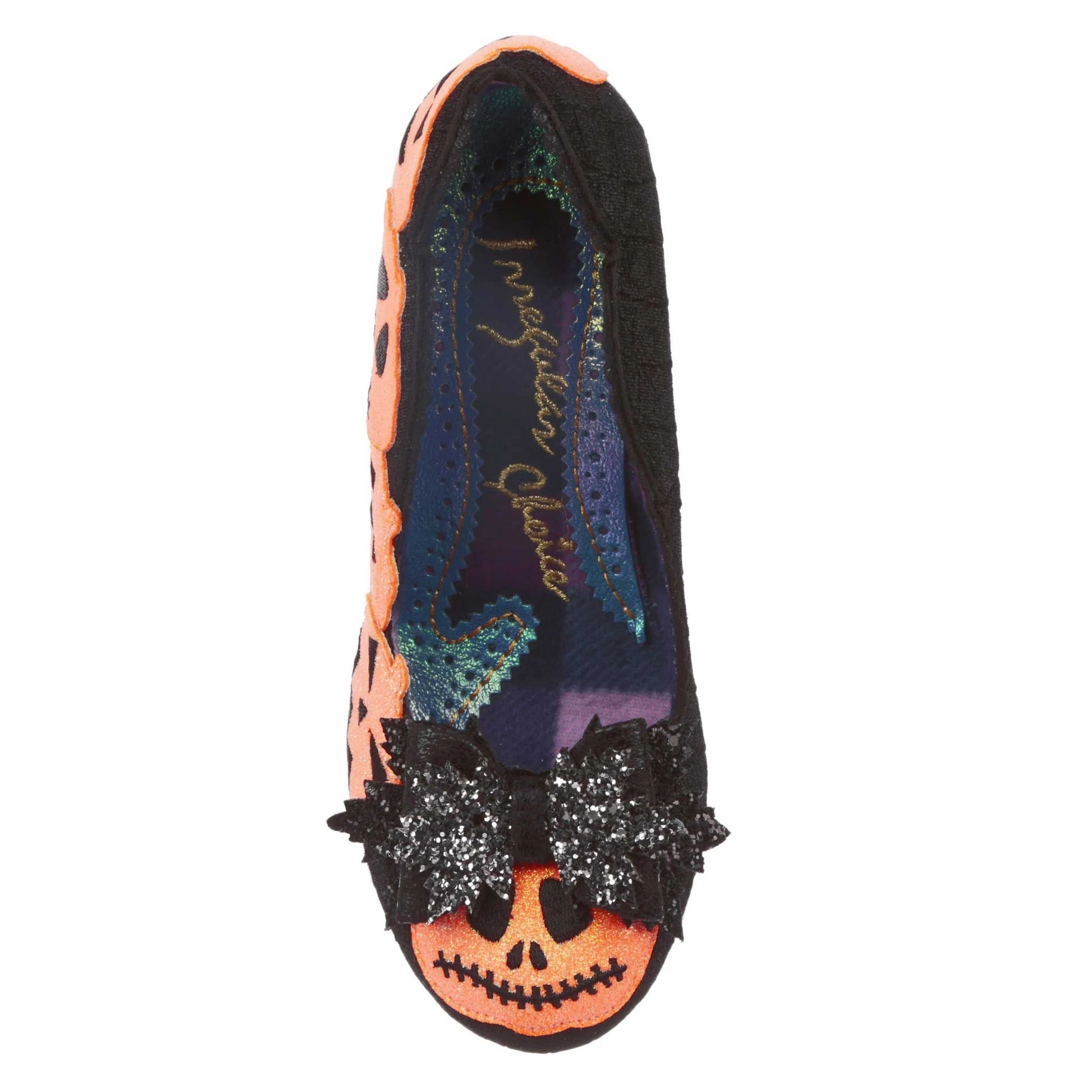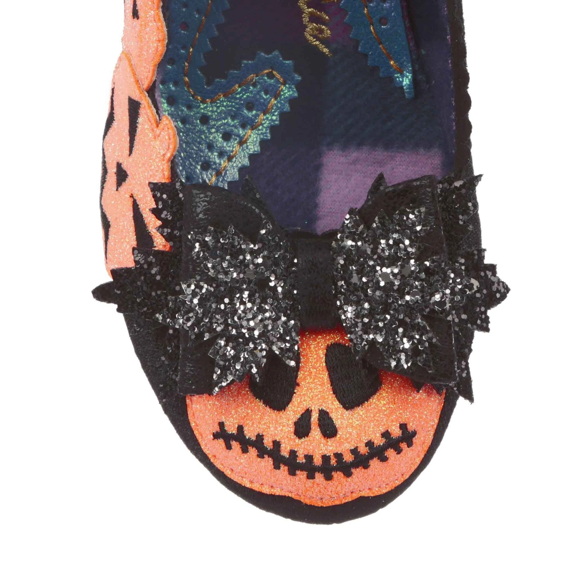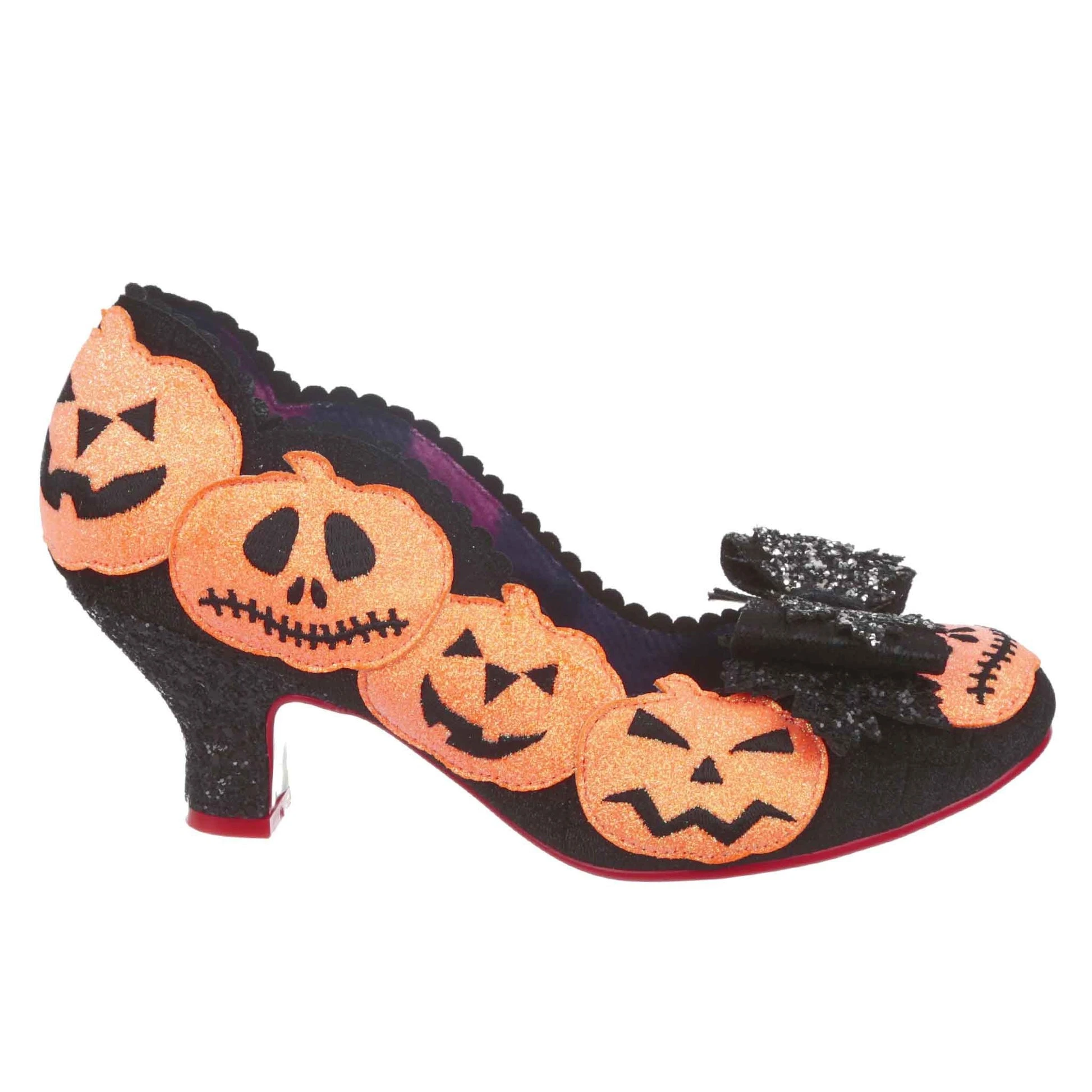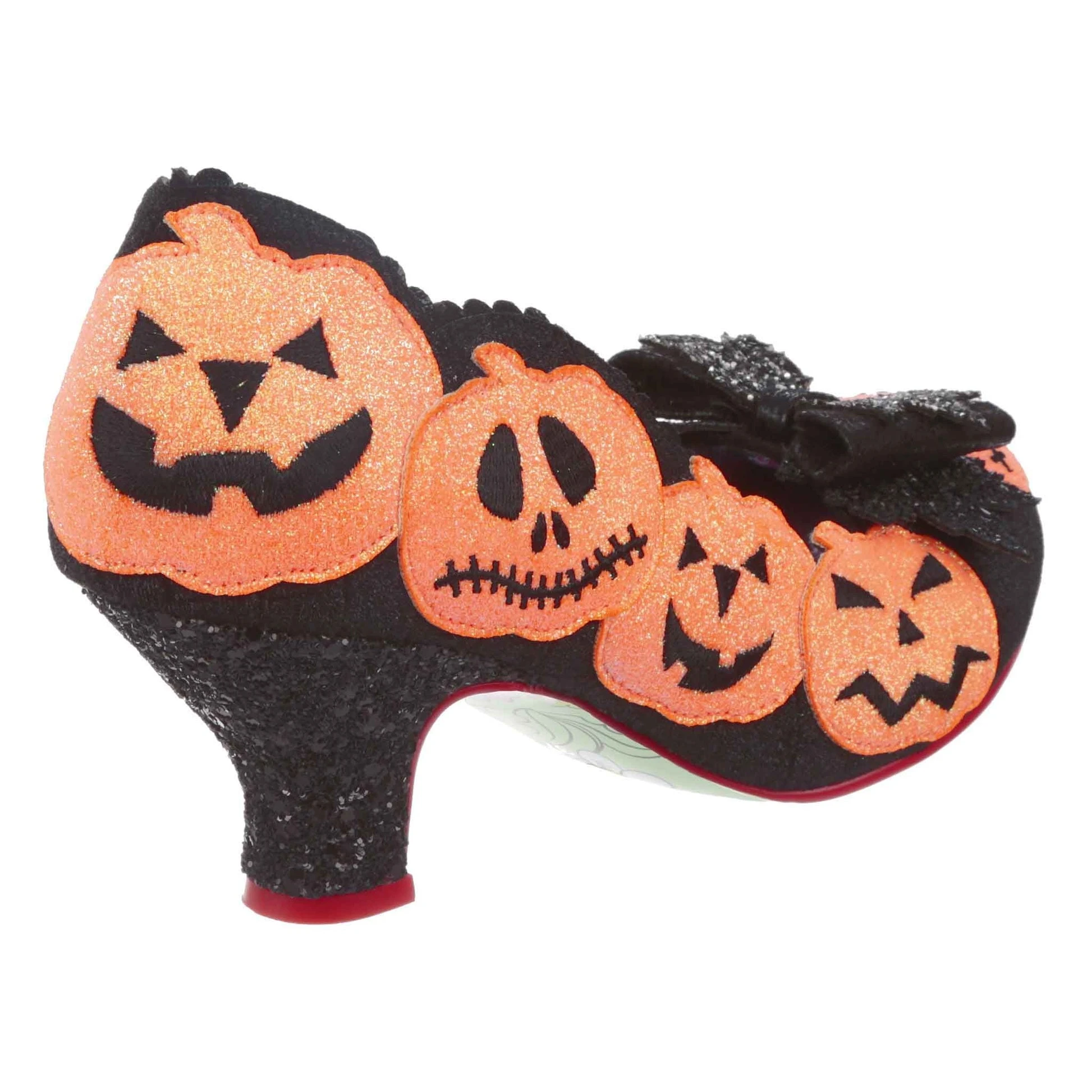 Spook yourself silly with these black and orange beauties! Perfect for prancing around the pumpkin patch, these spooky mid heels are a must-have with orange glitter jack o’lanterns with sinister expressions placed along the edge of this Halloween-tastic and wearable black glitter mid heel! Adorned with an eerie sparkly bow on the toe, these scary shoes are already haunting your fashion dreams!