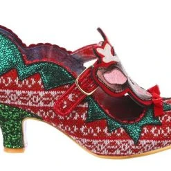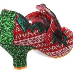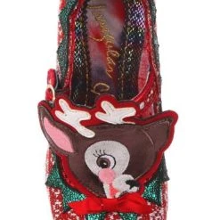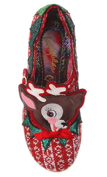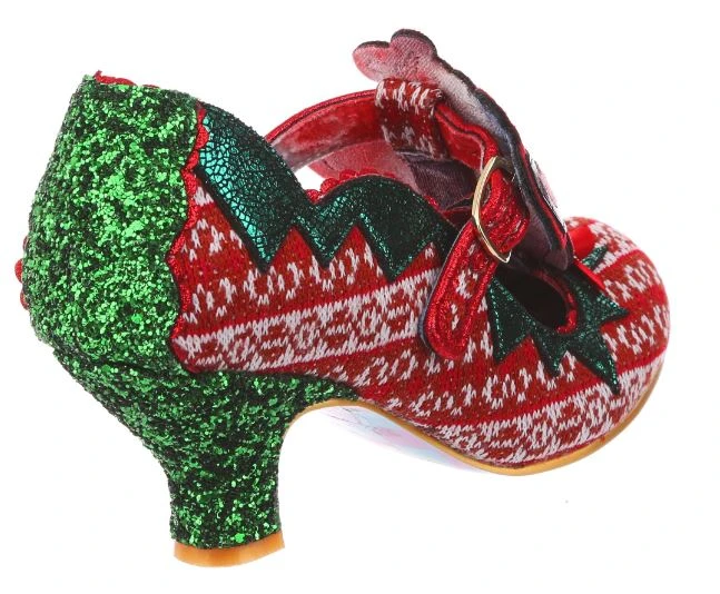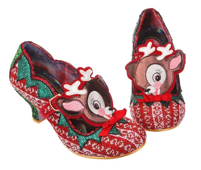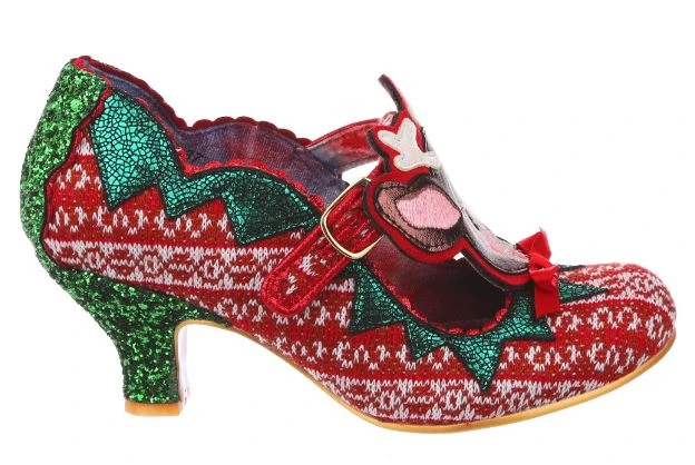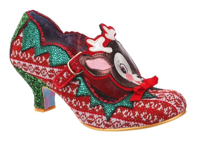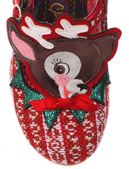 Time to play some Reindeer games? Be your best elf self in these festive fantasies! Adorned with the cutest little reindeer friend you ever did see, the Christmas jumper knit is topped with sweet red satin bow. With a comfy green glitter heel and T-bar buckle strap, these shoes will be top of your list this year!