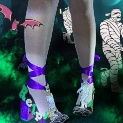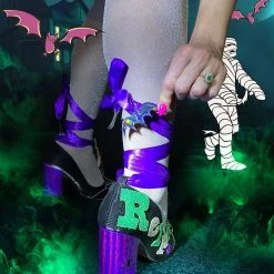 Wrap your legs up like a spooky mummy with these adorable heels! Featuring a super cute purple leg ribbon which is tipped with bats, these showstoppers feature some great Scooby sayings on the side in glitter textures, as well as artwork of a wrapped up Scooby and mummy on the front of the foot too! Great for anyone who wants a bit of ghostly glam in their wardrobe!