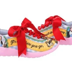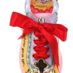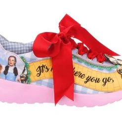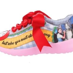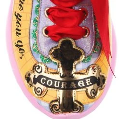 Brains, heart and courage – everything needed for the best of friends! These adorable statement trainers are adorned in everything the Wizard of Ozâ„¢, and the result is fabulous! The Yellow Brick Roadâ„¢ winds around the shoes, with beautiful script scrolling across, leading to the statement applique on each toe – a medal for courage and a ticking heart! Fastened with brilliant red ribbons, and featuring a print of our favourite adventurers on the heel, these trainers are surely not to be missed!