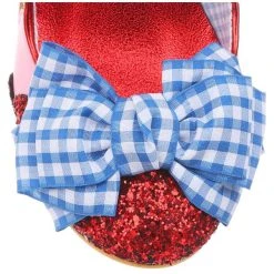 Nostalgia galore! These cuties are sure to make you feel all warm and fuzzy inside! Stunning scalloped panels of red glitter, pink pastel and golden shimmer lead into a fabulous print of the movie heroes gathered in front of the Emerald Cityâ„¢! A matching red glitter encrusted heel is paired with a statement blue gingham bow to make these something super special. Grab them and go on an adventure today!